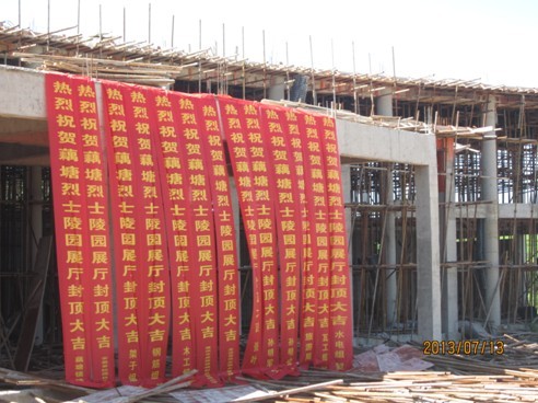 該工程造價約798萬元,工程內容包括高29.1米的紀念碑一座、建筑面積4053m2的展覽館一座及花崗巖廣場道路鋪裝15700m2。項目自開工以來,我單位通過精心策劃、統籌安排、科學管理,克服了項目實施過程中的環境、技術及協調等諸多難點,本工程主體結構于2013年7月13日順利封頂。