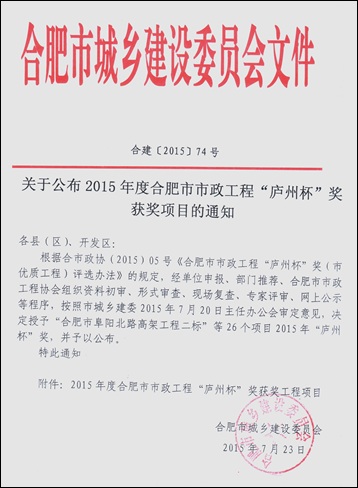 炎炎夏日,驕陽似火,我公司喜獲2015年度合肥市市政工程“廬州杯”獎,給酷熱的盛夏送來了陣陣涼意。由公司承建的合肥市高新區(qū)寧西路(長寧大道-肥西界)道橋及附屬工程經(jīng)合肥市城鄉(xiāng)建設(shè)委員會及合肥市市政工程協(xié)會審定,順利獲得此次獎項。