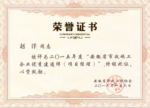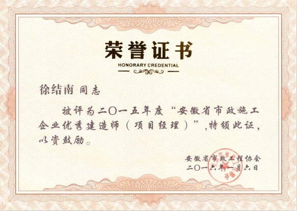 近日,從安徽省市政工程協會獲悉,我公司董光申、趙洋、徐結南三位同志被評選為2015年度“安徽省市政施工企業優秀項目經理”,此次全省共評選出66位市政優秀項目經理,恭喜上述三位同志獲得此殊榮。