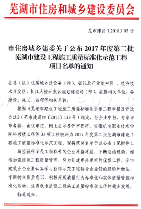 2017月12月15日,由蕪湖市、無為縣建設(shè)工程質(zhì)量監(jiān)督站及相應(yīng)專家組成的評審組,按照《蕪湖市建設(shè)工程施工質(zhì)量標(biāo)準(zhǔn)化示范工程申報(bào)及評選辦法》(蕪市建通知[2015]129號),對該工程申報(bào)蕪湖市建設(shè)工程施工質(zhì)量標(biāo)準(zhǔn)化示范工程進(jìn)行現(xiàn)場復(fù)審。