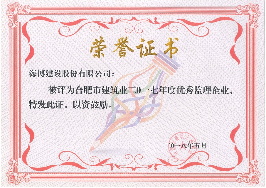 由朱海生秘書長宣讀了合建協【2017】15號《關于表彰全市建筑業2017年度優秀企業、單項先進企業、先進個人的決定》,我公司在此次優秀企業評選中再次獲得優秀施工總承包企業、優秀監理企業稱號,連續兩年獲得此項榮譽,這將更加增強我們海博人勇于爭先、砥礪奮進、堅定前行之斗志和信心。然后由潘孝艷副會長對“合肥市建筑工程優質結構獎”及“合肥市建筑施工安全生產標準化示范工地”評選辦法進行了修訂,明確了企業項目榮譽申報的方向及具體要求。