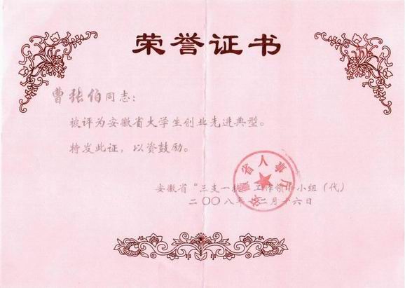 我公司執行董事曹張伯被安徽省人事廳評為“安徽省大學生創業先進典型”。